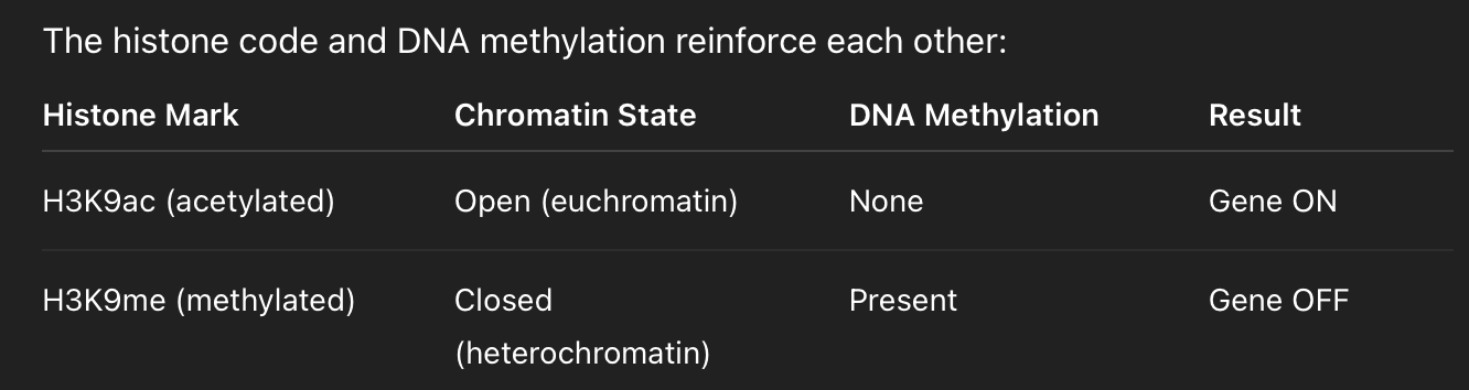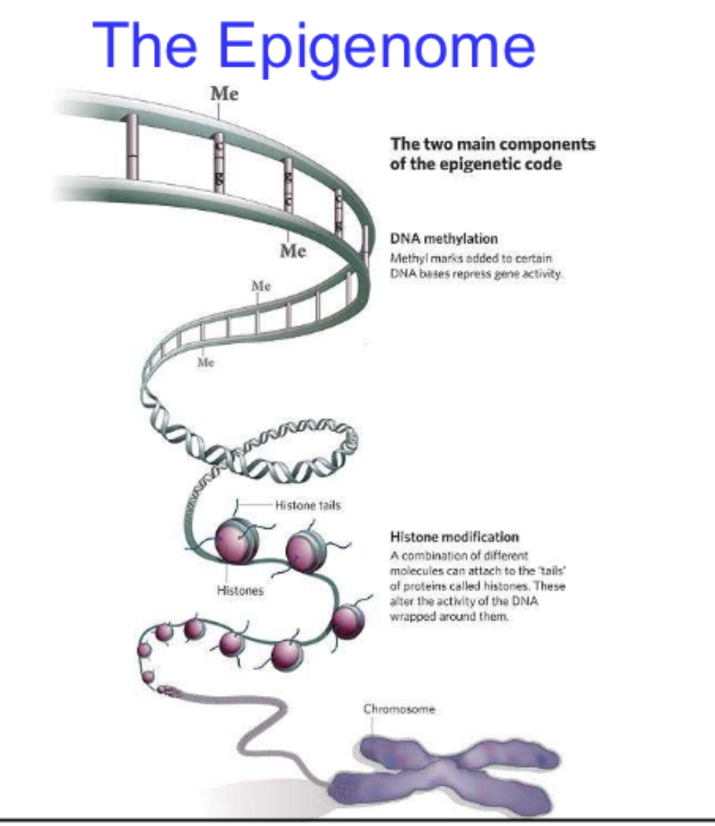 different molecules can be added to ‘tails’ of histones –> alter activity of DNA wrapped round them