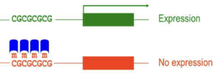 silences genes blocking TFs binding or by attracting proteins (MBDs) that compact chromatin via Histone modifications