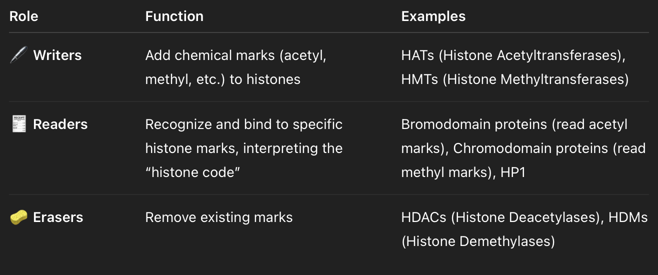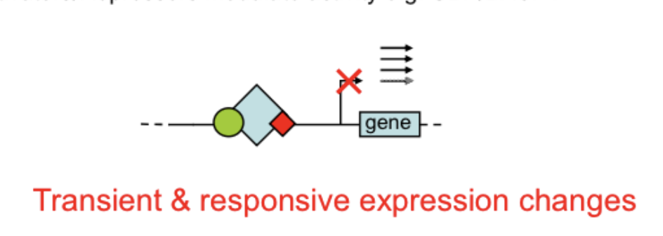 = ‘volume knobs’, not as permanent as DNA methylation, easily reversible , but more stable than TF control