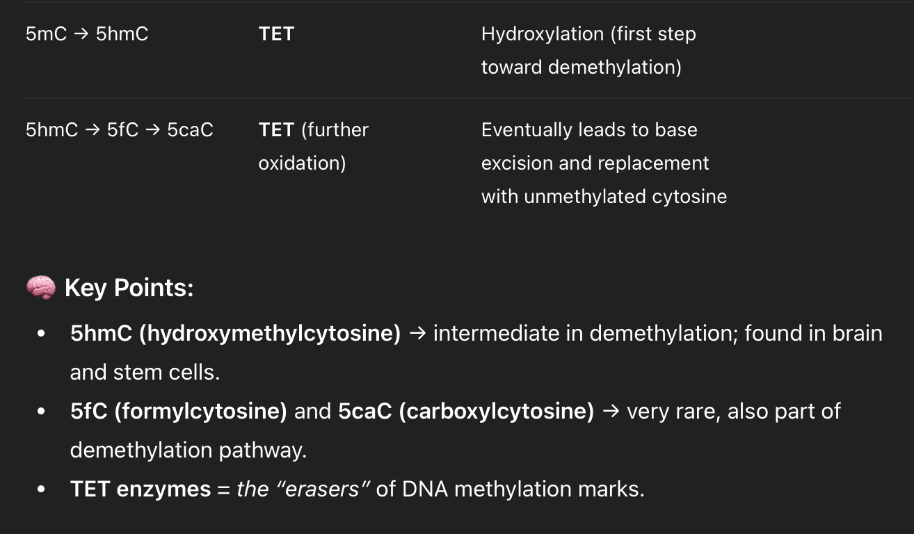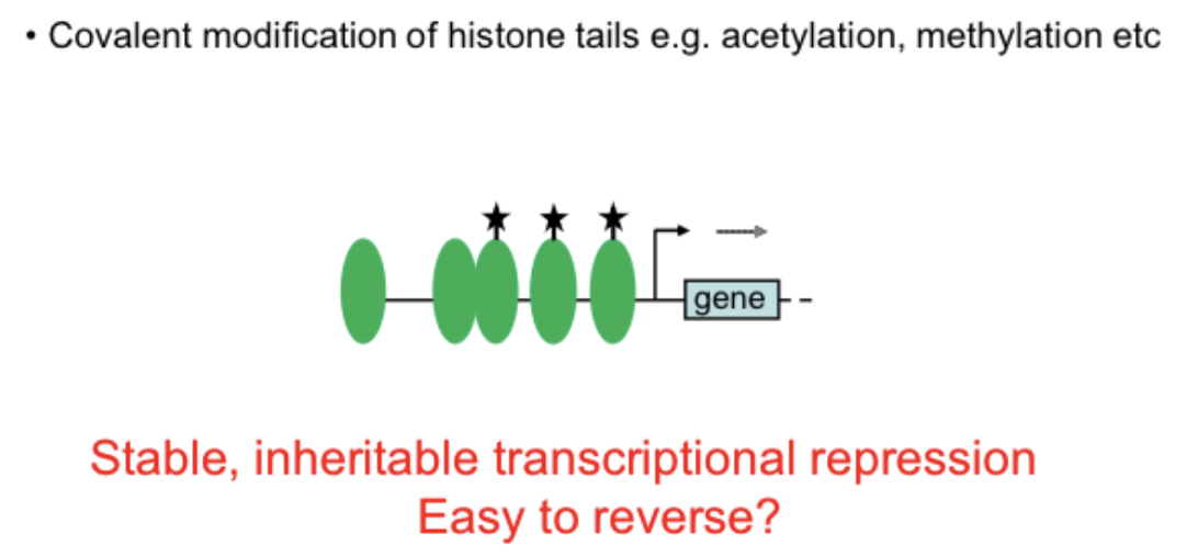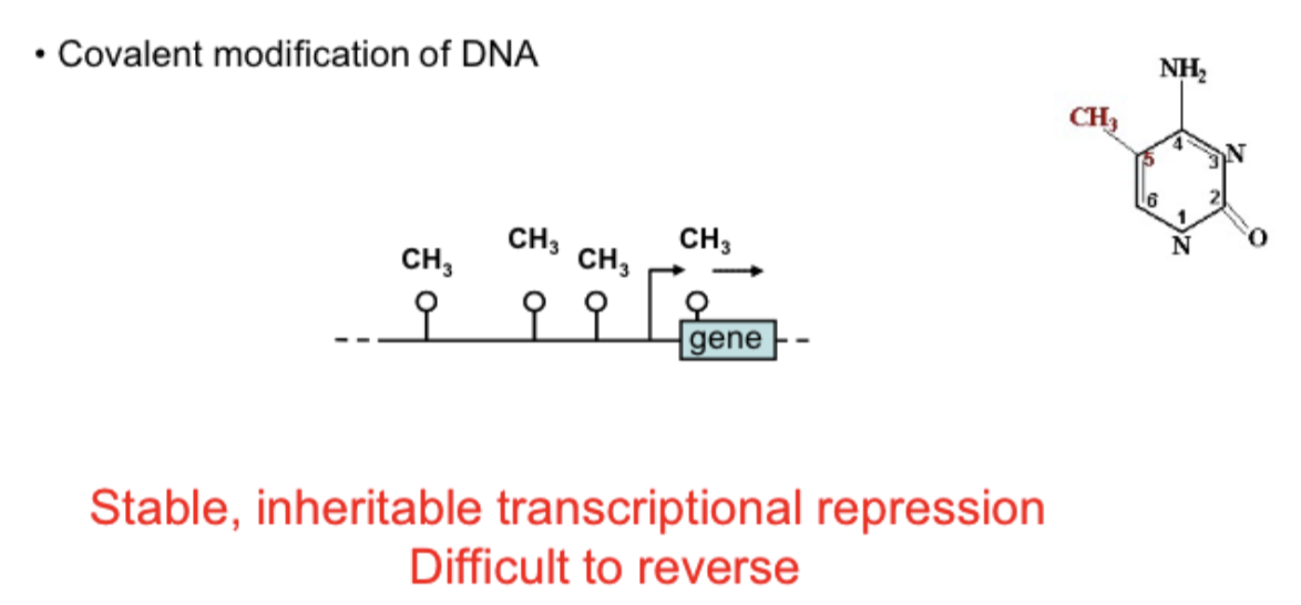 = covalent modification –> permanent unless removed –> can be passed down to daughter cells = heritable