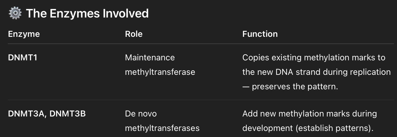 describe the difference in the roles in methylation of DNMT1 vs DNMT3A + DNMT3B
