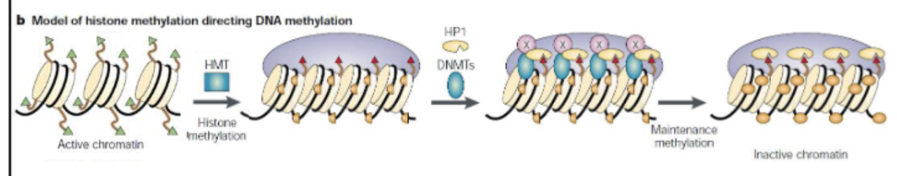 H3K9me3 → HP1 → DNMT1 → DNA methylation → maintenance of heterochromatin/repressed state