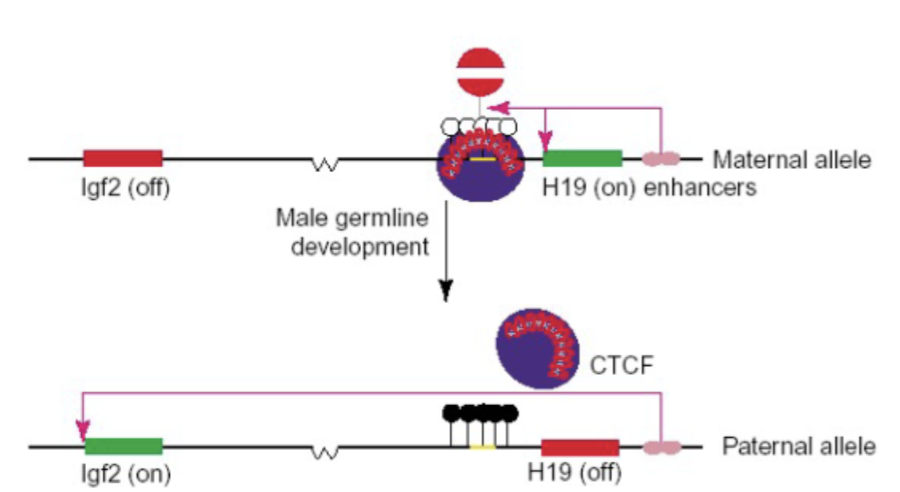 Igf2 and H19 located close together and share enhancers –> only 1 is expressed depedning which parents chromosome its on