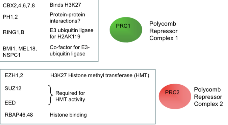 describe and explain the functions of the 2 main Polycomb complexes in epigentic silencing