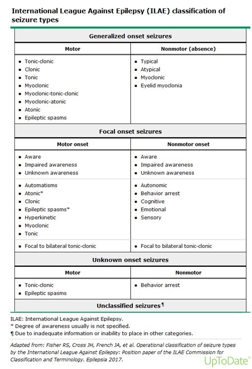 -Seizure type is classified based on the initial manifestation of the seizure as generalized, focal, or unknown (if seizure onset is either missed or obscured)