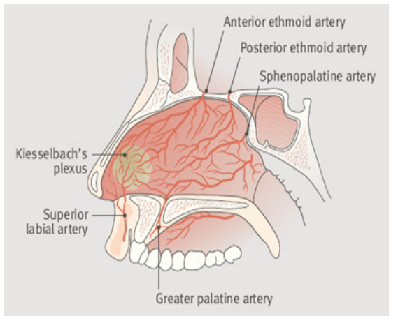 Posterior nasal cavity, often from branches of sphenopalatine arteries of nose