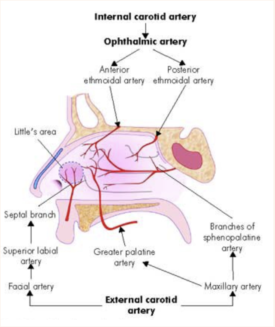 All of the following are blood vessels supplying the nose, but which one accounts for 90% of the blood flow to the nose and is therefore the target for ligation if bleeding does not stop?