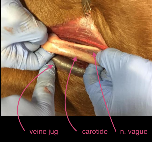la chirurgie se fait au 1/3 moyen de l’encolure, 2cm dorsalement à la veine jugulaire, avec une incision de 10 cm entre les muscles brachiocephalicus et omohyoïdeus.