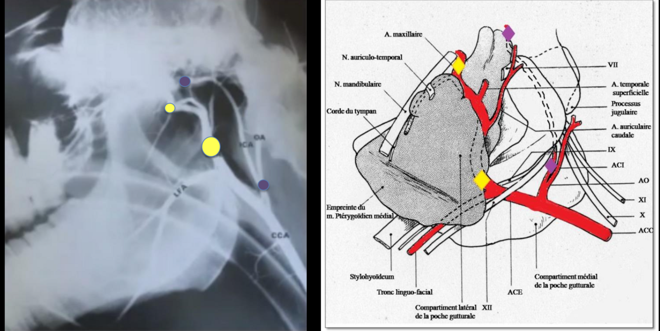 quelles sont les artères importantes qui passent dans la poche gutturale (3) Dans quel compartiment?