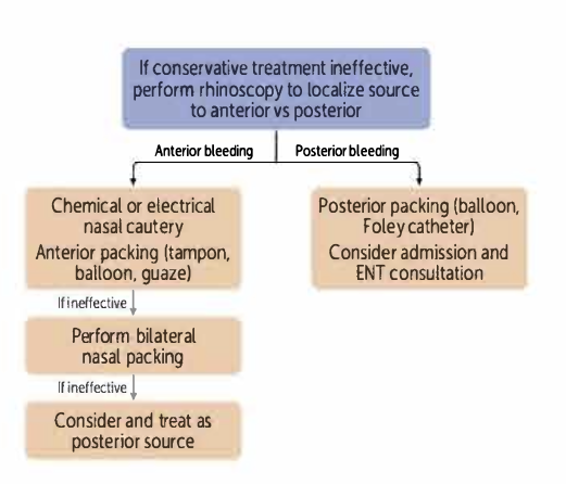 If anterior and a bleeding source is seen, it can be cauterized with either electric cautery or chemical cauterization with silver nitrate and packing (nasal tampons, ribbon gauze, nasal balloon catheter).