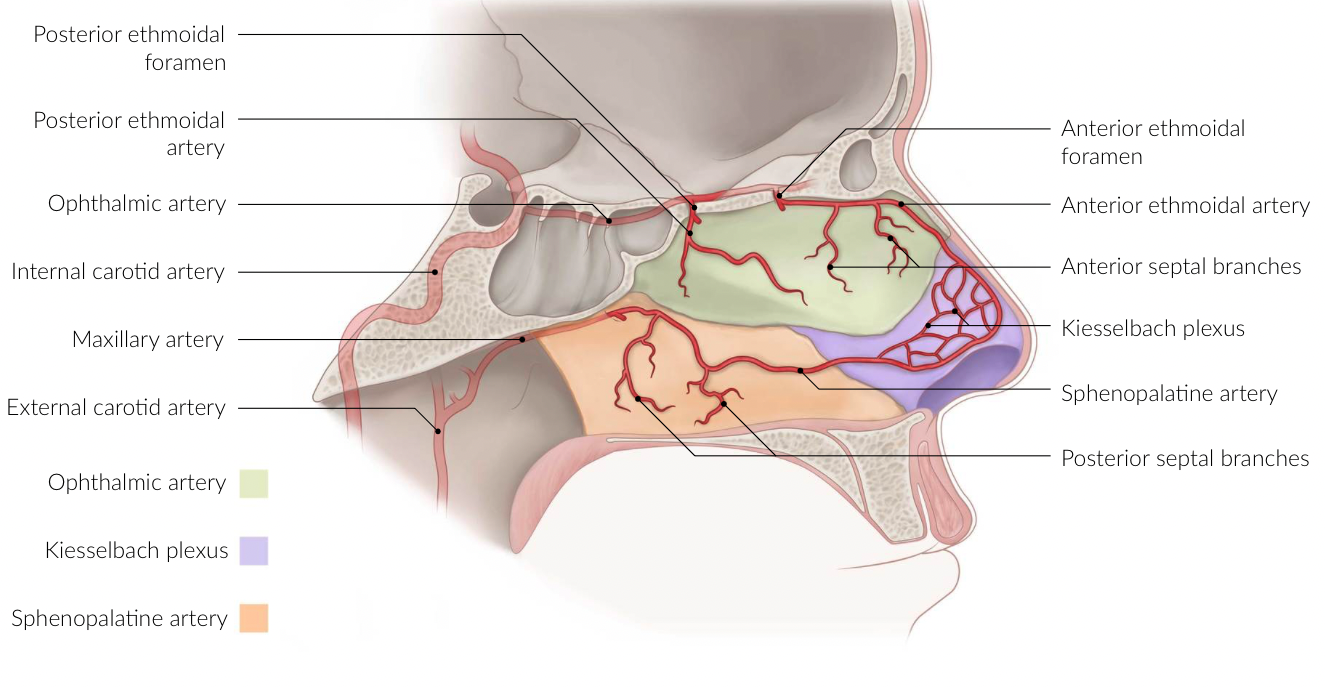 The anterior region of the Kiesselbach plexus is formed from the internal carotid artery, which produces an ophthalmic artery, which then terminate to the ethmoid and septal arteries. Specifically, the Kiesselbach plexus is the anastomosis of the septal branch of the anterior ethmoidal artery and the lateral nasal branch of the sphenopalatine artery. Another vessel from the facial artery joins the network from the superior septal branch.