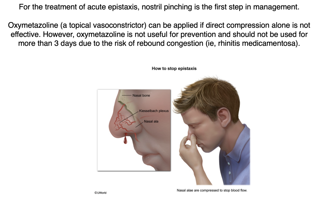 Topical vasoconstriction (oxymetazoline, phenylephrine), which almost always stops the bleeding. These patients should also be treated with medication to lower their blood pressure. The diastolic pressure has to be reduced below 90 mm Hg.