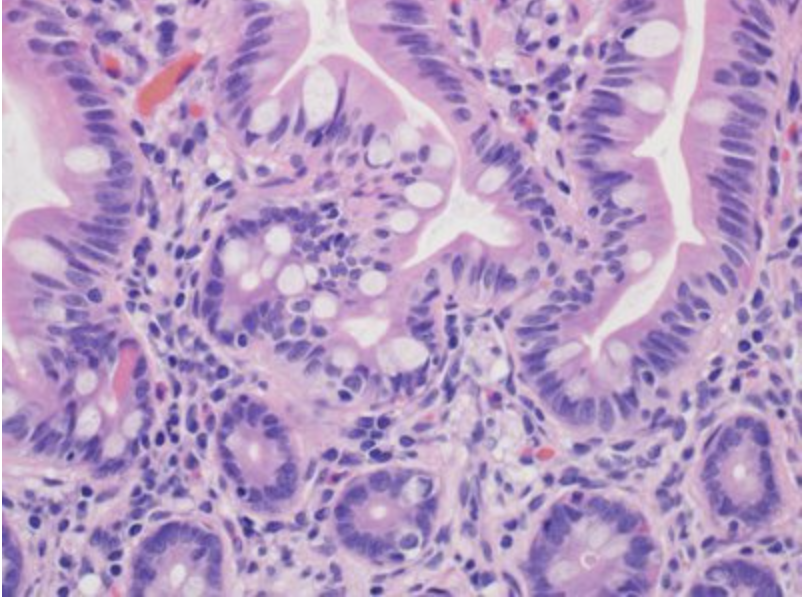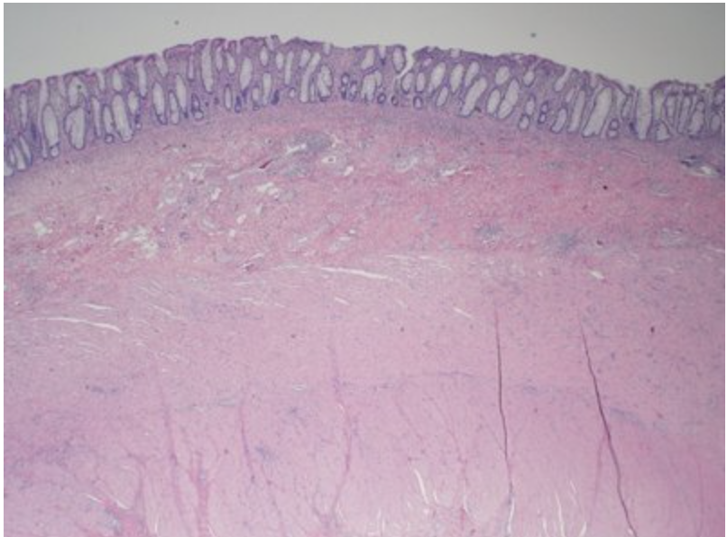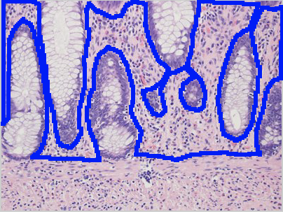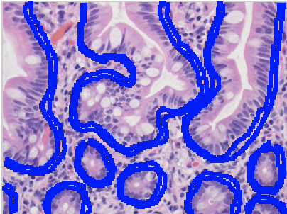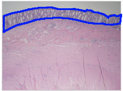 This is a picture of a colon. The correct answer is the epithelium which lines the lumen of the colon. Remember that in the human body, the epithelial tissue’s functions include secretion, absorption and/or protection.