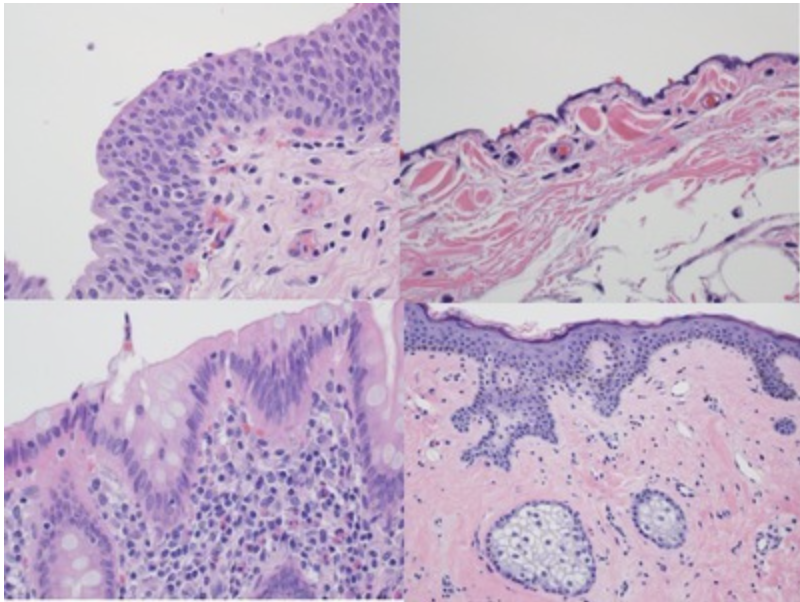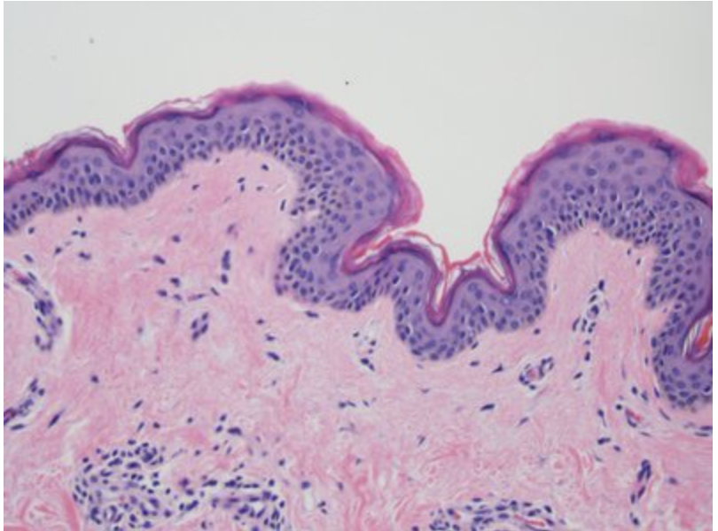 The correct answer is a “Stratitified” epithelium, or more precisely a stratified squamous epithelium from the skin. The cells form multiple layers with the less differentiated ones near the underlying connective tissue. The main functions of this squamous epithelium are protection and prevention of water loss.