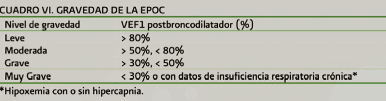 Clasifiación de la gravedad de EPOC de acuerdo a la VEF1 postbroncodilatador: