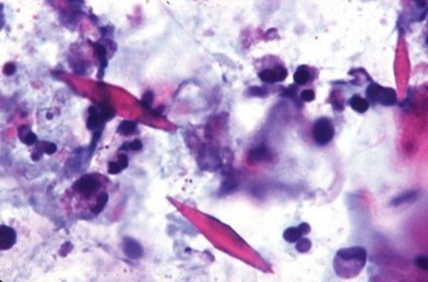 Composed of eosinophil protein galactin-10, formed following eo degranulation (often IL-5 med)