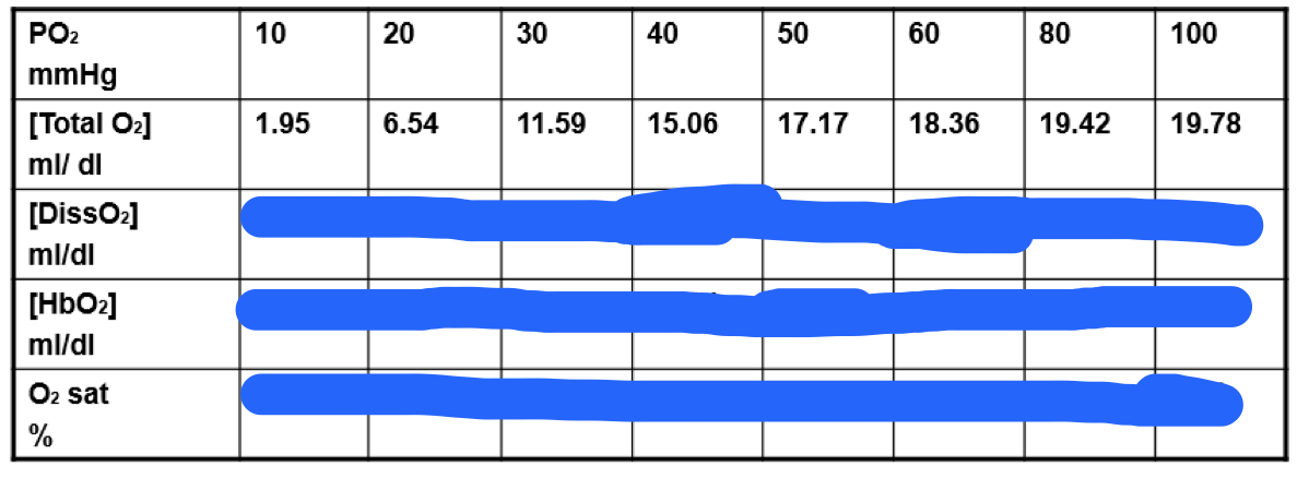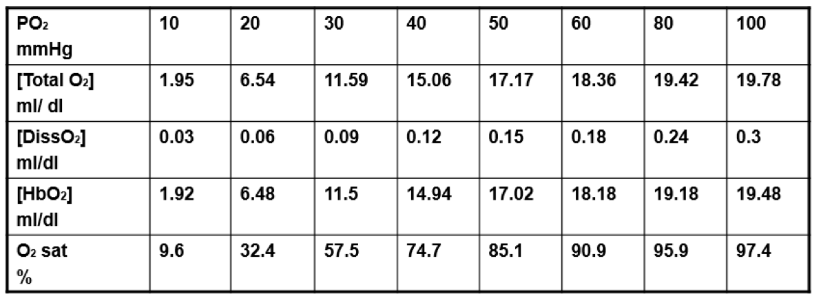 Blood [O2] content, ml/dl = [0.003 ml/(mmHg x dl) x PO2 (mmHg)] + [Hb] g/dl x 1.34 ml/g x % O2 sat]