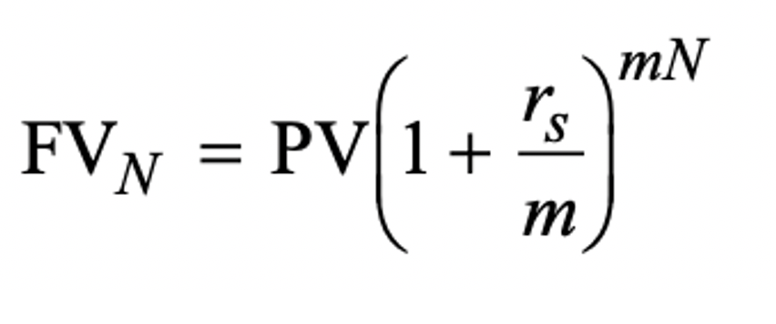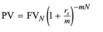 where rs is the stated annual interest rate, m is the number of compounding periods per year, and N now stands for the number of years. Note the compatibility here between the interest rate used, rs/m, and the number of compounding periods, mN. The periodic rate, rs/m, is the stated annual interest rate divided by the number of compounding periods per year. The number of compounding periods, mN, is the number of compounding periods in one year multiplied by the number of years. The periodic rate, rs/m, and the number of compounding periods, mN, must be compatible.