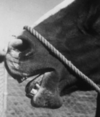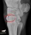 Congénital, résulte en un « gonflement » non douloureux de la poche gutturale par de l’air (a/n de la gorge)