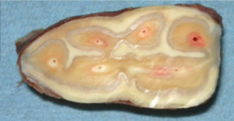 A sub-occlusal transverse section of a mandibular 06 equine cheek tooth placed with its apical aspect facing upwards. All six pulp horns have open pulp horns containing viable pulp (that has caused pink staining of the adjacent dentine during sectioning).