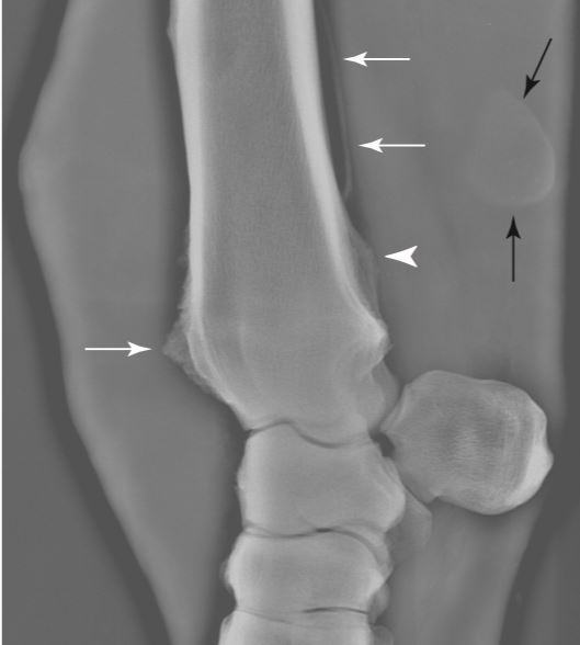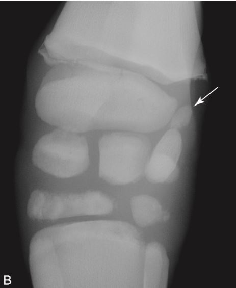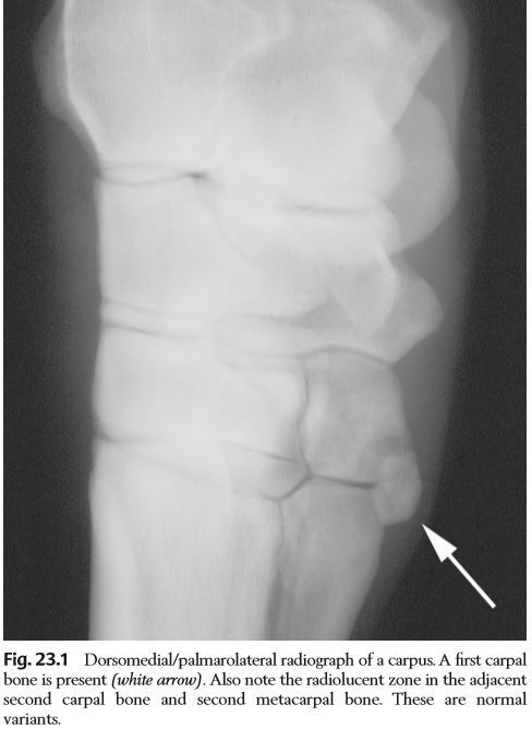 The arrow is pointing to the ulnar epiphysis which is normally no fused in this horse at this age…there is incomplete ossification of the carpal bones in this horse.