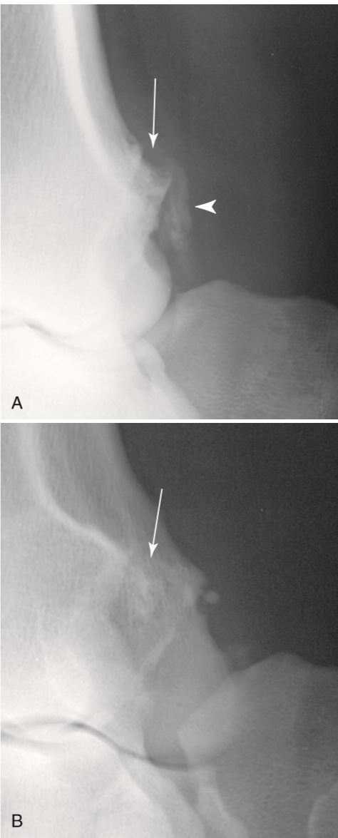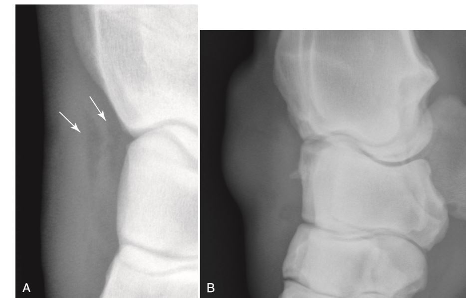Intracapsular fat. Showing that there is no joint effusion. B has joint effusion.