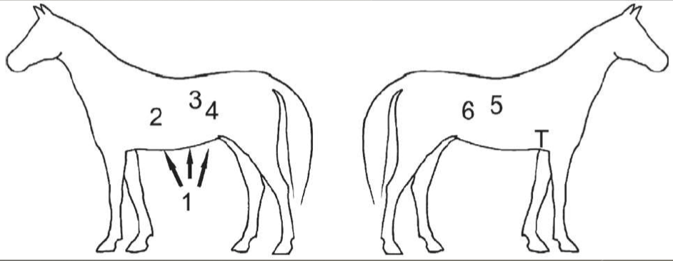 This 14 year old QH gelding was normal this morning and at lunch, but was severely painful this afternoon.