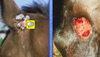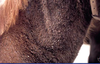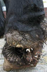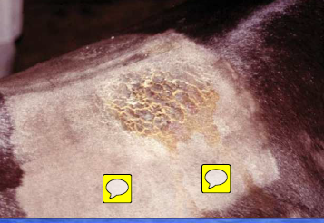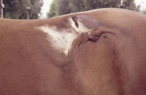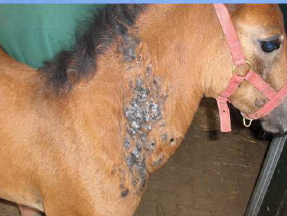 the condition is mostly seem in late winter and early spring when there is a combination of circumstances involving a thick haircoat, lack of grooming hygyiene and dirty tack.dirt between the saddle and the skin results in irritation and inflamation. the distribution of the scabs and alopeciaare characteristic and the area may be painful.secondary bacterial infection may occur causing folliculitis.