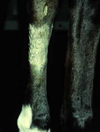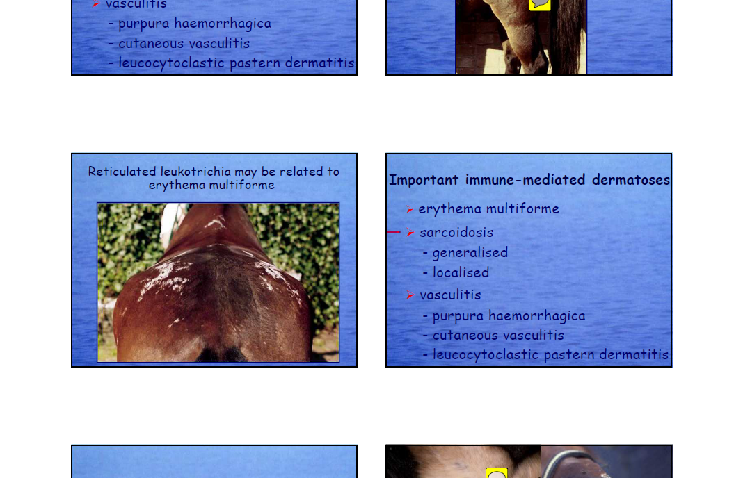 equine sarcoids is described as a systemic dz associated with exfoliative dermatitis, severe wasting and sarcoidal like dermatitison only one or two lower limbs. the dz starts with scalling,crusting and thinner hair coat on the affected limb. those horses are nt systemically ill and may perform well. if untreated the dermatitis deteriorates and the crusting gets more severe. then the horse gets lame.