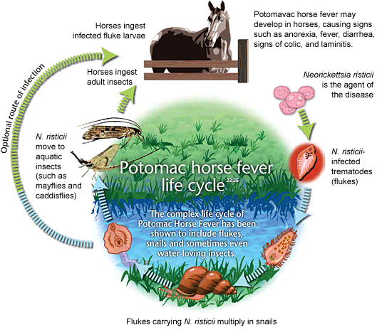 b. Ingestion of N. risticii carried in houseflies secretions