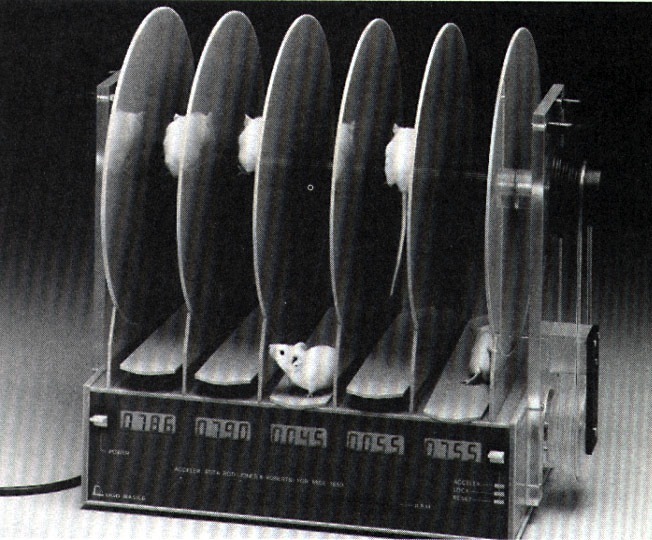 Used to assess effects of drugs, brain damage, or diseases on motor coordination or fatigue resistance. Mouse and rat models; constant or accelerating speed models; drum has non-slip surface.