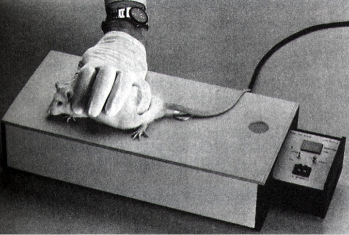 Test for analgesic effects. Rodent’s tail is placed over window on platform while being restrained. Intense beam of light is applied to tail (60-170 C) and latency period is measured until tail is flicked out of the light beam.
