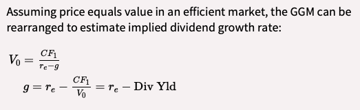 Calculate and interpret the implied growth rate of dividends using the Gordon growth model and current stock price.