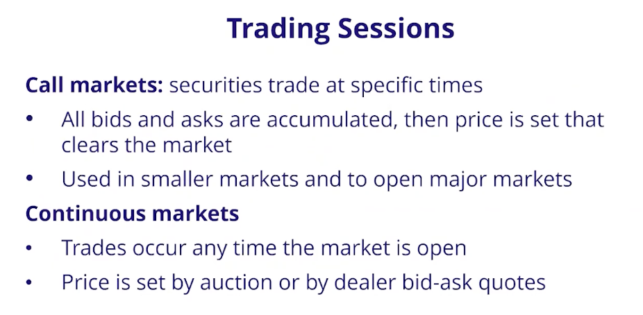 39.1 Describe: trading sessions - call markets vs continuous markets