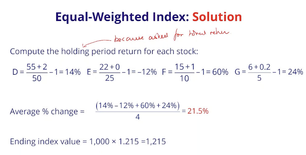 40.1 Describe the process of working out the total return of an equal-weighted index: