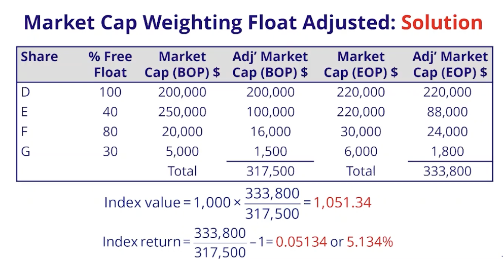 market cap weighted - could be calculated by shares x price, but sometimes is calculated including free float too