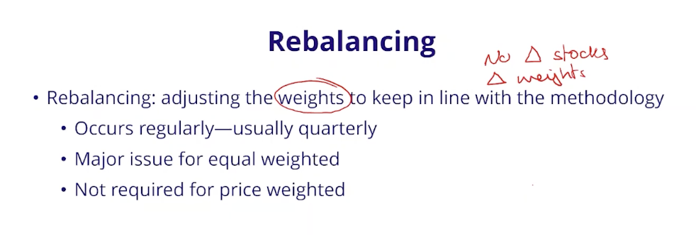 An equal-weighted index will be rebalanced most frequently because as stock prices change, their representation in the index needs to be adjusted. Price-weighted and market capitalization-weighted indexes do not usually need rebalancing.