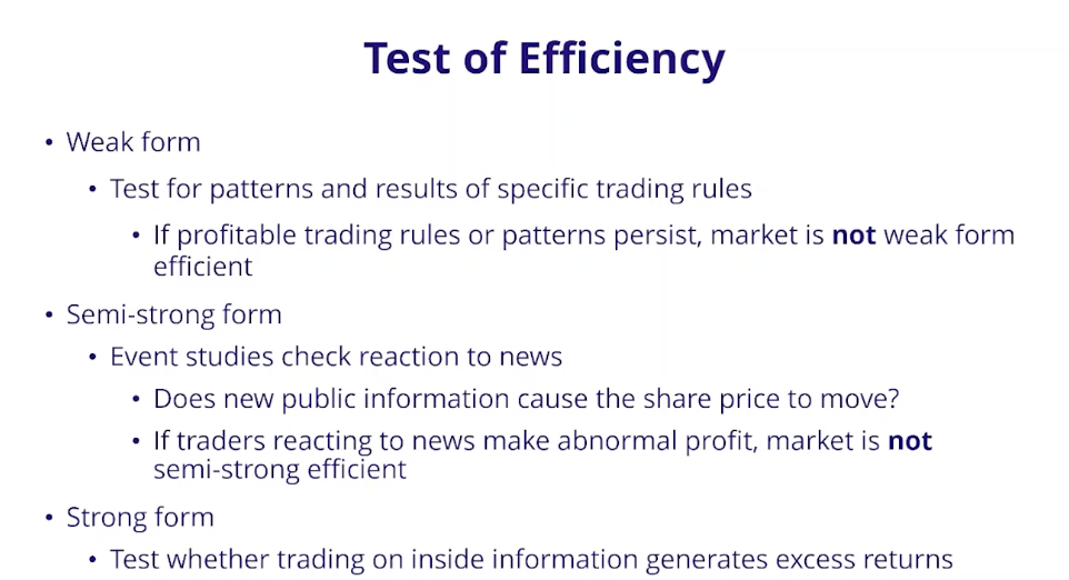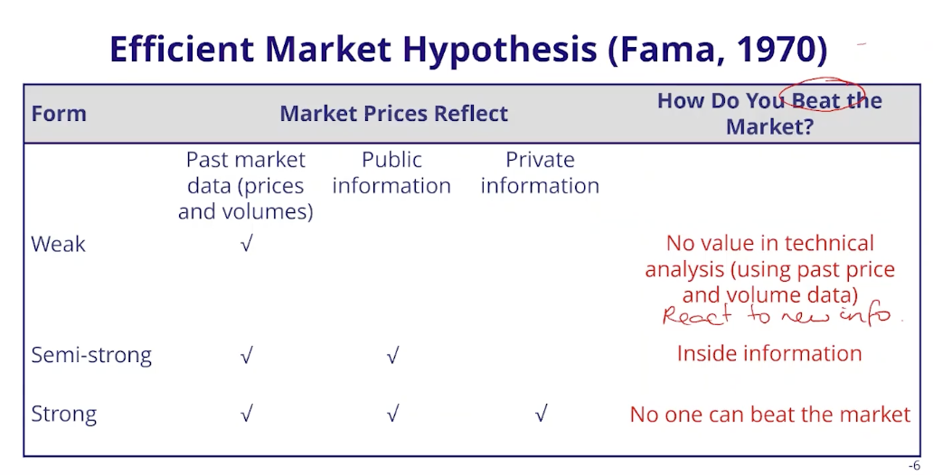 41.1 Efficient market hypothesis: how do past market data, public information, and private information apply to a weak, semi-strong, and strong market form.