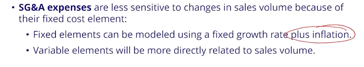 General and administrative expenses are often more fixed than variable and can be modeled using a fixed growth rate that includes expected inflation.