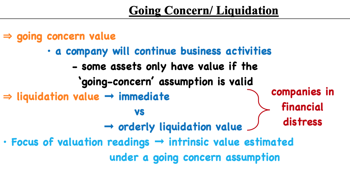 Explain going concern and liquidation value (immediate vs orderly)