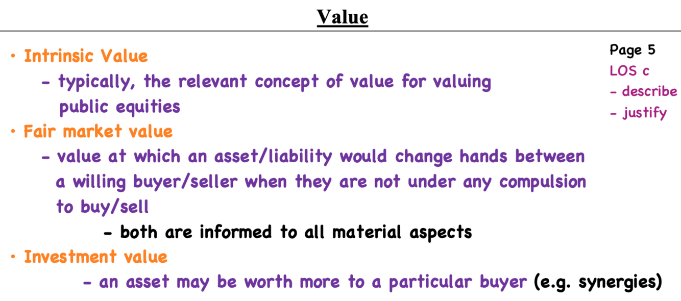 Explain what intrinsic, fair and market value is?