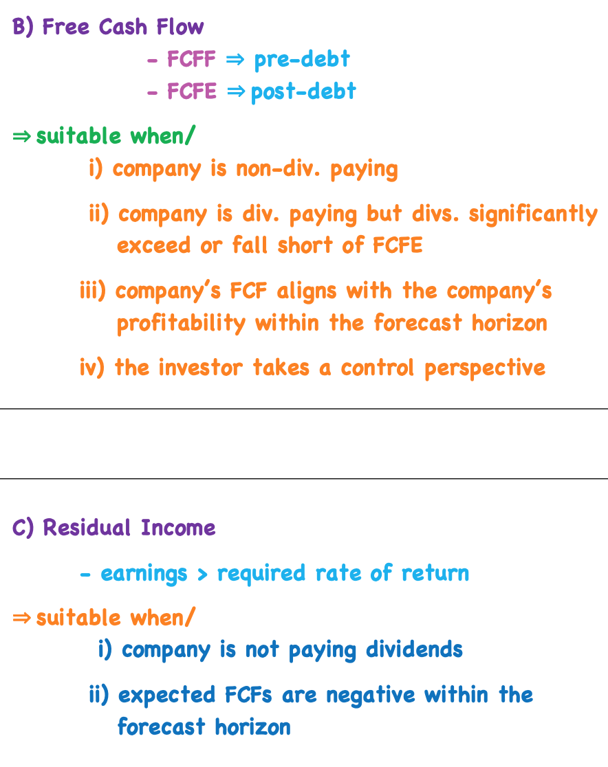 Explain Free cash flow and residual income and when each are appropriate?