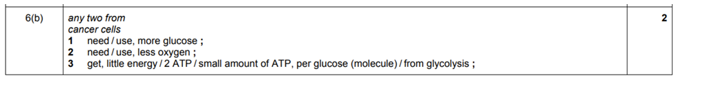 Q. State how glucose and oxygen demands differ in normal and cancer cells. (2)