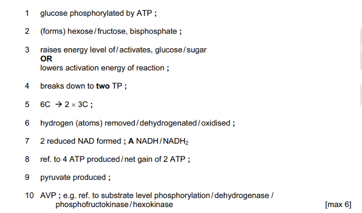 Q. Outline the process of glycolysis in a mammal. [6 marks]