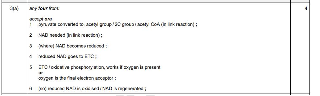 Q. Explain why the link reaction only occurs when oxygen is available. (4)
