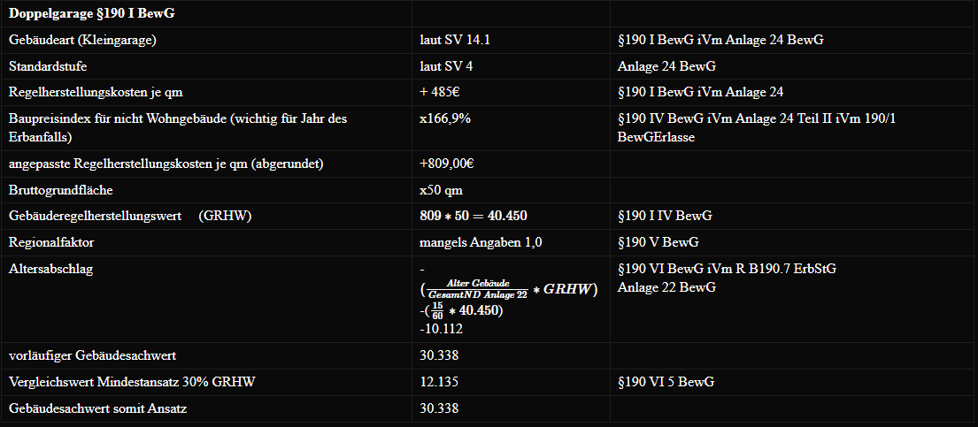 2. Garage §190 I BewG → Regelherstellungskosten des Gebäude gem. Grundfläche