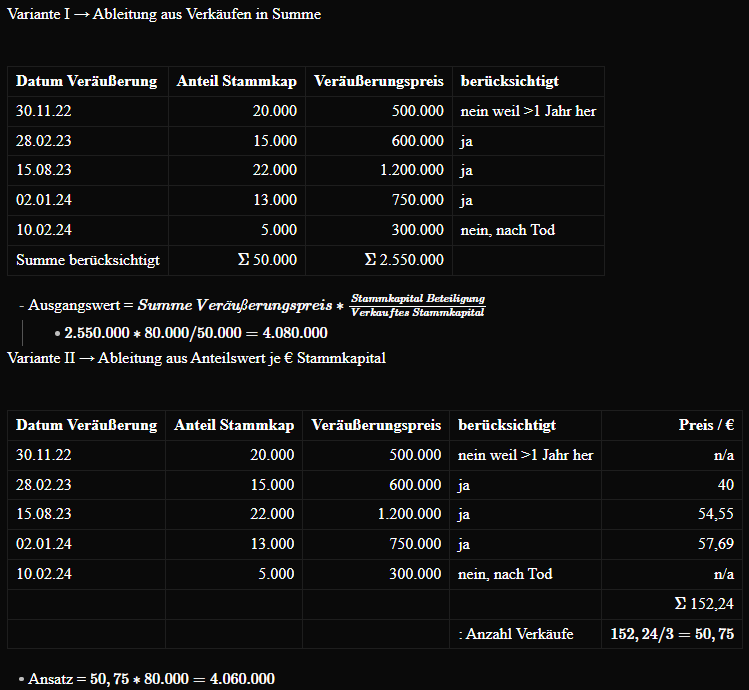 - gem. §12 I ErbStG iVm §11 I BewG - niedrigster Kurswert am Stichtag - Beteiligungen 20% → keine Beteiligung §13b I Nr. 3 ErbStG da unter Mindestbeteiligung und kein §13a I, II ErbStG einschlägig, keine Poolvereinbarung §13b I Nr. 3 S.2 ErbStG