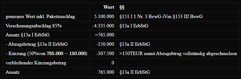 - §19 III ErbStG iVm H E 19 ErbStH - Tabelle der Grenzwerte in H19.1 - beispielbezogen: 677 TEUR → da 705TEUR > 677 TEUR - oder: - Steuer auf vorherige Grenze = 15%x600.000= 90.000 - Steuer von 50% des übersteigenden Betrag (50%x3.113.300x19%= 1.556.650) - Steuer nach Härtefall = 1.646.650 - Wenn Steuer nach Härtefall > Steuer nach §19 I ErbStG → KEINE Anwendung