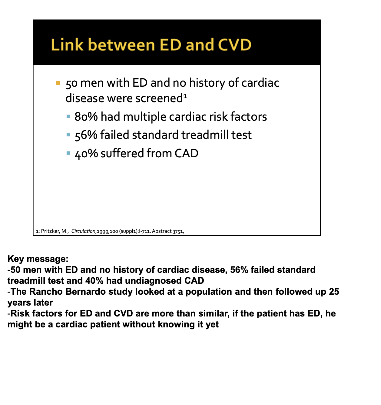 -50 men with ED and no history of cardiac disease, 56% failed standard treadmill test and 40% had undiagnosed CAD