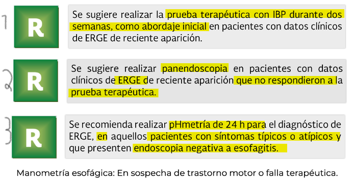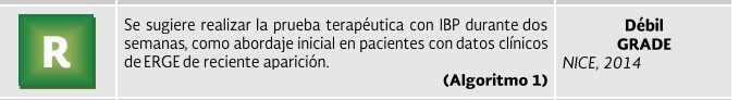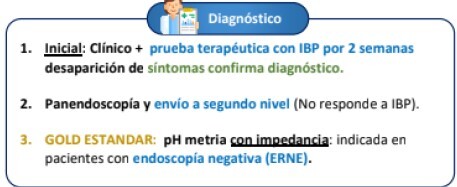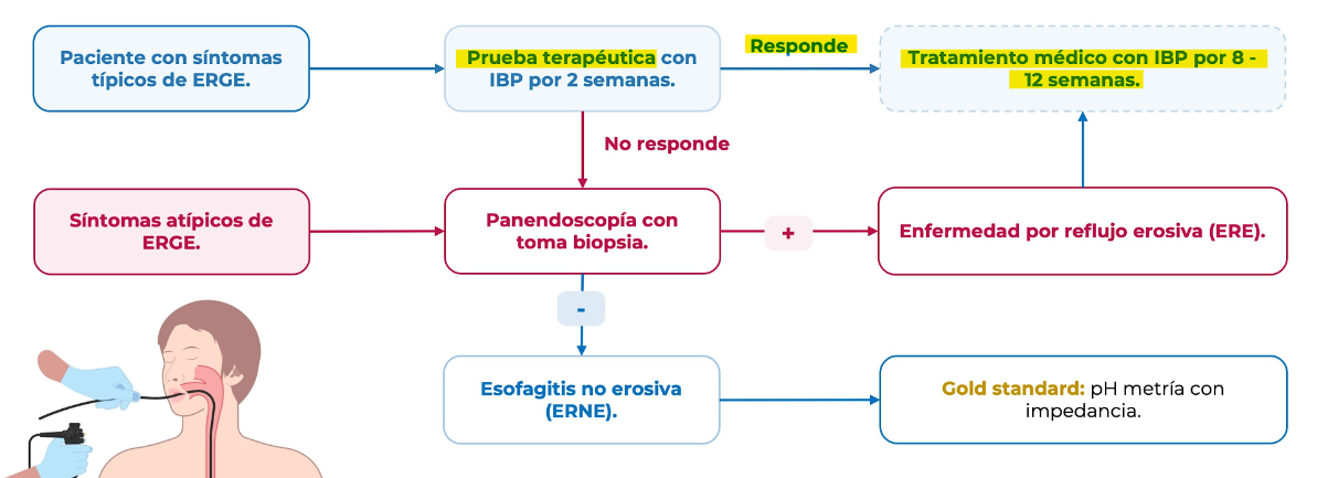 Prueba terapéutica empírica con IBP a dosis estándar por 2 semanas a dosis estándar y a la desaparición de sintomas se confirma el diagnóstico.